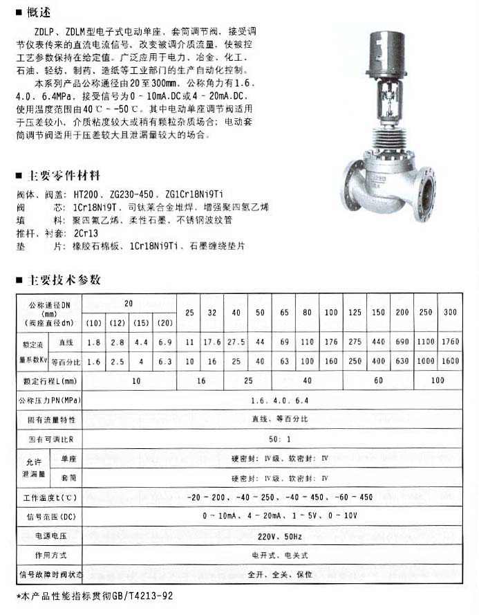 本系列產(chǎn)品公稱通徑由20至300mm.公稱角力有1.6、4.0、6.4MPa,接受信號為0-10mA.DC或4-20mA.DC.使用溫度范圍由40C--50℃.其中電動單座調(diào)節(jié)閥適用于壓差較小、介質(zhì)粘度較大或稍有顆粒雜質(zhì)場合:電動套筒調(diào)節(jié)閥適用于壓差較大且泄漏量較大的場合。
